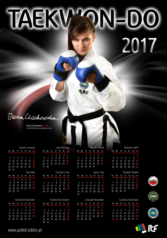 Polski Związek Taekwon-Do informuje, że tradycyjnie został przygotowany jednostronicowy kalendarz ścienny na 2017 rok w cenie 7 zł (brutto) za sztukę. Format B2 (475 na 680 mm), z listwami w kolorze czarnym, papier kredowy gramatury 200 g, lakierowany UF.