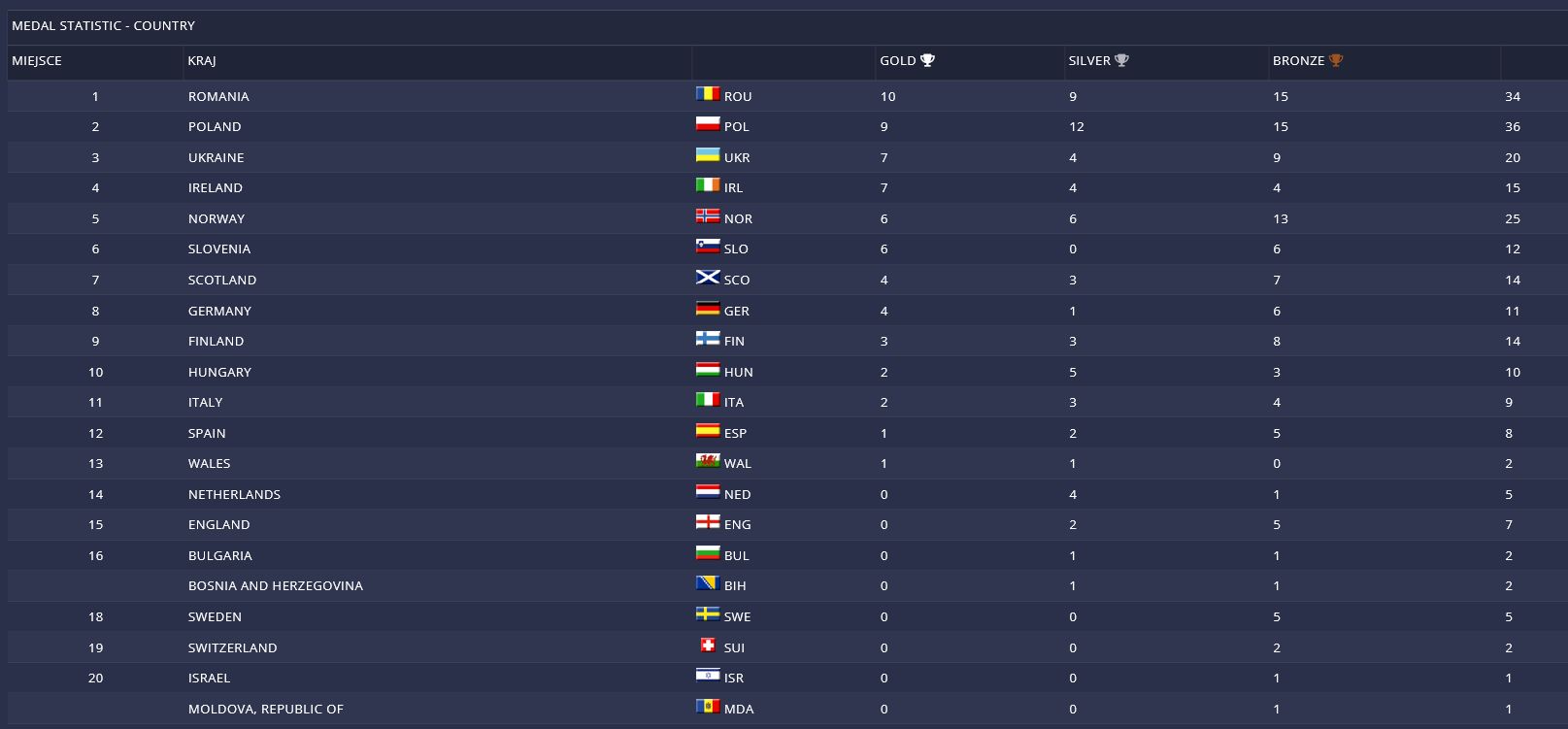 Zwycięscy klasyfikacji generalnej reprezentacja Rumunii, zdobywała medale w walkach, układach, konkurencjach technicznych indywidualnie oraz drużynowych technikach specjalnych i testach siły. Polską siłą w Kluż-Napoka były konkurencje drużynowe, wliczając w to walki aranżowane. Pięć złotych medali w konkurencjach drużynowych, oraz po dwa indywidualne w walkach i konkurencjach technicznych dały nam drugą pozycję w Europie. Licząc wszystkie złote, srebrne i brązowe, to zdobyliśmy o dwa medale mniej aniżeli w Poreczu, Chorwacja 2022, ale więcej złotych. Pozwoliło to nam wskoczyć na drugi stopień podium w generalce. Cofając się jeszcze o rok do Hiszpanii, zdobycze naszej kadry to 51 medali w tym 17 złotych.