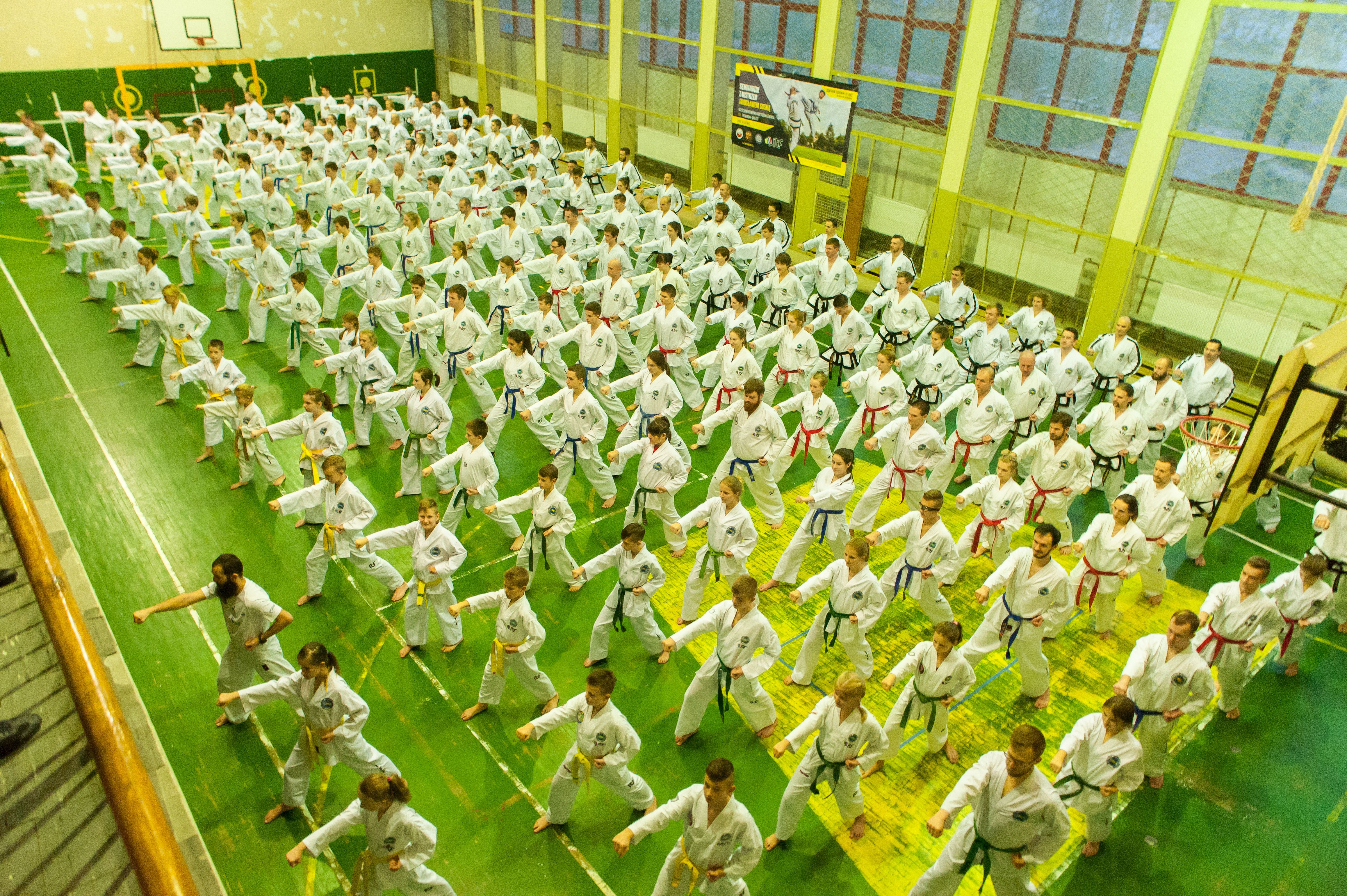 W szkoleniu wzięła udział rekordowa liczba 183 osób zrzeszonych w klubach z całej Polski. Pomimo tego, że seminarium dedykowane jest dla kolorowych pasów, pojawiła się silna grupa stopni mistrzowskich w tym 3 posiadaczy stopnia VI Dan – Krzysztof Cywiński, Jakub Jegliński oraz Robert Jasiński. Tradycyjnie już jak w latach ubiegłych nie zabrakło weteranów naszego szkolenia, wśród nich byli posiadacze stopnia V i IV Dan. Wraz ze swoimi zawodnikami w zajęciach brali udział niemal wszyscy instruktorzy klubowi. W tym roku gościliśmy dwóch zawodników z Ukrainy (Pan Artem Kychko III Dan oraz pan Andrii Karchevskyi IVDan) oraz zawodnika z Irlandii( pan Christopher Conlon 2 cup). Wart podkreślenia jest fakt, iż wśród uczestników byli ćwiczący ojcowie wraz ze swoimi dziećmi, dało się również zauważyć swego rodzaju sztafetę pokoleń- obok bardzo młodych adeptów stali w szeregach ćwiczących bardzo dojrzali wiekiem miłośnicy naszej pięknej sztuki walki. Poza ogromną dawką wiedzy i praktyki dodatkową atrakcją było losowanie niespodzianek ufundowanych przez sponsora Łukasza Grygla. Nagrodami były książki oraz specjalistyczny program szkoleniowy do nauki układów wydany w wersji elektronicznej Black Belt. Pragnę złożyć specjalne podziękowania dla drugiego sponsora Pana Jonathana Morrisa fundatora doboku firmy Mightyfist .