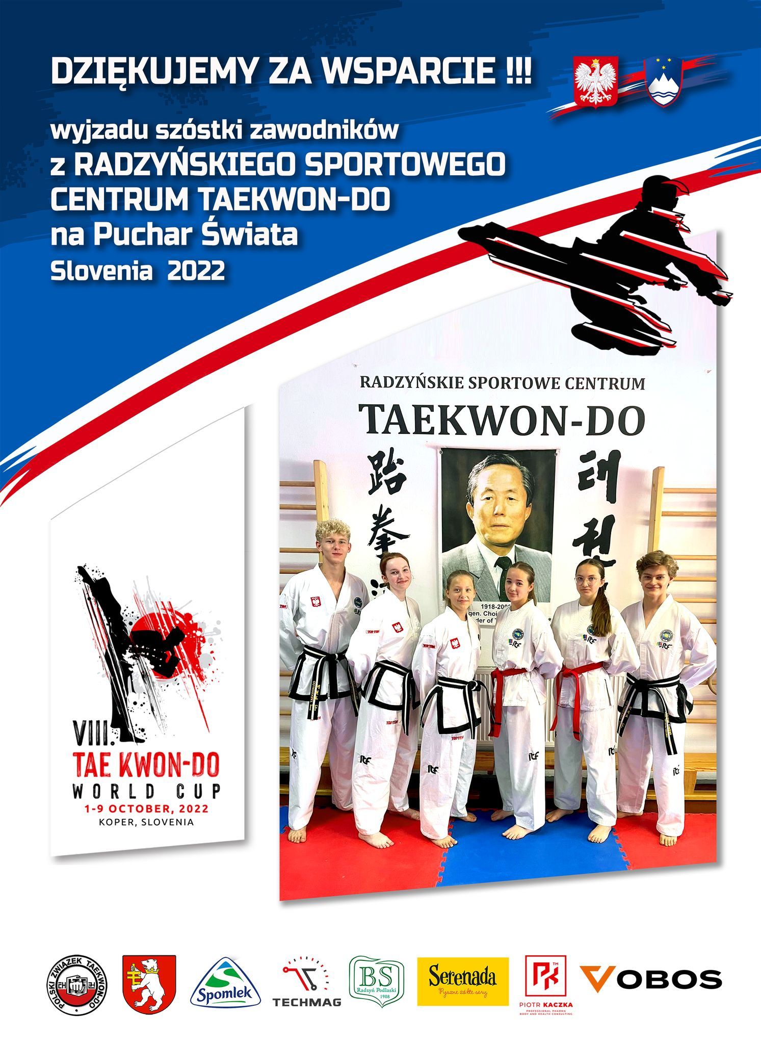 Najbardziej utytułowany jest Jakub Cieślak, który już niejednokrotnie stawał na podium zawodów międzynarodowych zdobywając medale w konkurencjach drużynowych podczas Mistrzostw Europy w Hiszpanii i Chorwacji, teraz czas aby dorzucił medal w konkurencjach indywidualnych. Oprócz Jakuba radzyński klub posiada w swym składzie Alinę Kaznadziej, która dopiero w tym roku jako juniorka młodsza wielkim sukcesem rozpoczęła swą przygodę na arenie międzynarodowej zdobywając z drużyną Mistrzostwo Europy w technikach specjalnych, dokładając do tego brązowy medal w walkach do 60 kg. Na pewno nie zabraknie emocji i walki do ostatnich sekund podczas pojedynków Zuzanny Mierkiewicz, która na ostatnich zawodach o prym na Starym Kontynencie odpadła tuż przed strefą medalową a w rywalizacji na arenie krajowej zdobywając medale Mistrzostw Polski za każdym razem pokazywała niesamowity charakter i wole walki. Debiutanci jadący zdobywać doświadczenie na arenie międzynarodowej i powalczyć o medale to Ewelina Andryszczyk, Nikola Kuśmierowska i Michał Cieślak, którzy nieraz stawali na podium zawodów ogólnopolski włącznie z Mistrzostwami Polski. Cała sześcioosobowa ekipa przygotowania do startu rozpoczęła już pod koniec sierpnia tak aby być jak najlepiej przygotowanym do walki na VIII Pucharze Świata w Słowenii. Dopełnieniem przygotowań były międzyklubowe konsultacje w Mińsku Mazowieckim w ramach Central Poland Taekwon-Do Club w barwach których będzie można zobaczyć zawodników z Radzyńskiego Sportowego Centrum Taekown-do, BKST Sonso Bytom, LZS BAT Bełchatów, MKST Mińsk Mazowiecki, Poznański Sportowy Klub Takewon-Do, UKS Taekwon-Do Świętochłowice, Taewo Klub Wschodnich Sportów Walki w Warszawie, Tomaszowska Akademia Taekwon-do